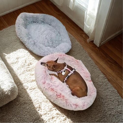 超ロングファーの柔らかなボリュームがワンちゃん・ネコちゃんの身体をふんわり支え、不安を和らげながら心地よい睡眠姿勢を自然にサポートします。